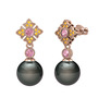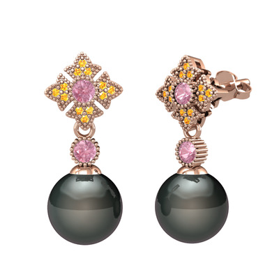 Siyah inci, pembe kuvars ve sitrin 14 ayar rose altın küpe