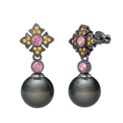 Siyah inci, pembe kuvars ve sitrin 925 ayar siyah rodyum kaplama gümüş küpe
