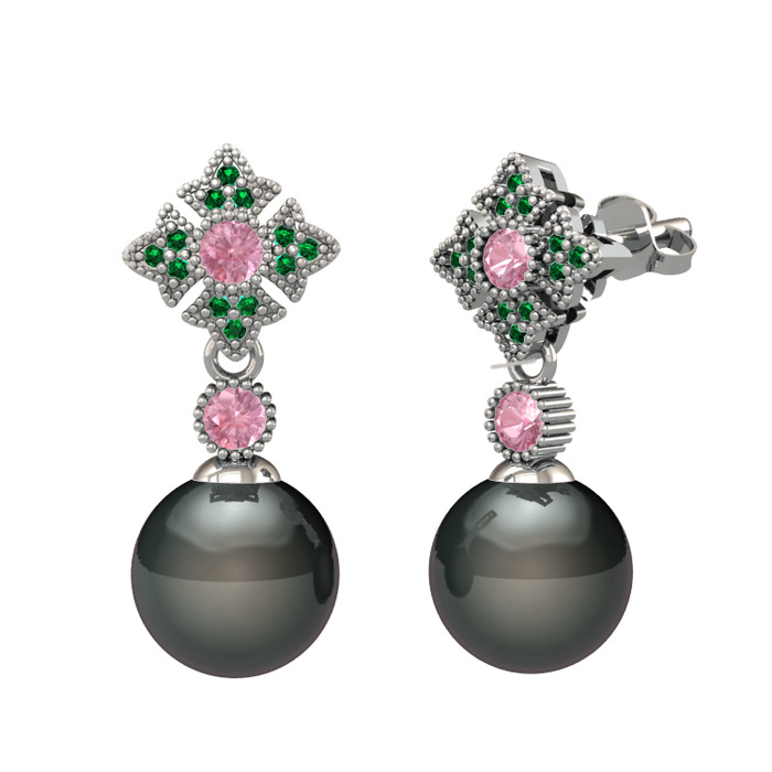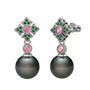 Siyah inci, pembe kuvars ve yeşil kuvars 8 ayar beyaz altın küpe