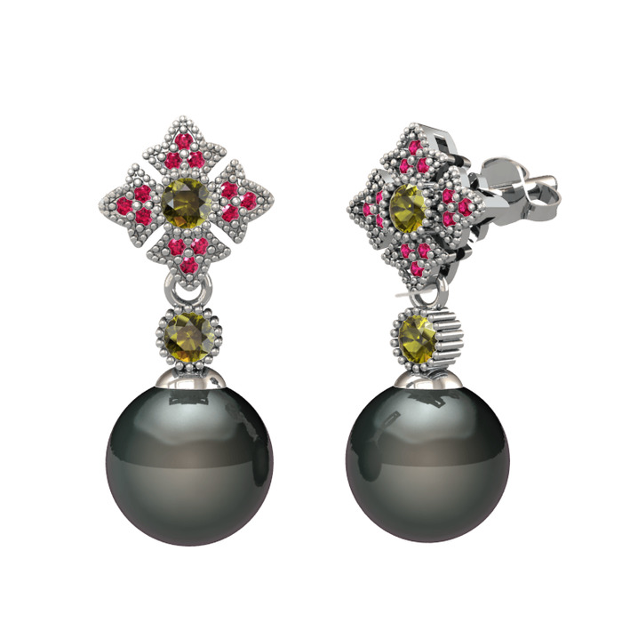 Siyah inci, peridot ve rodolit garnet 18 ayar beyaz altın küpe