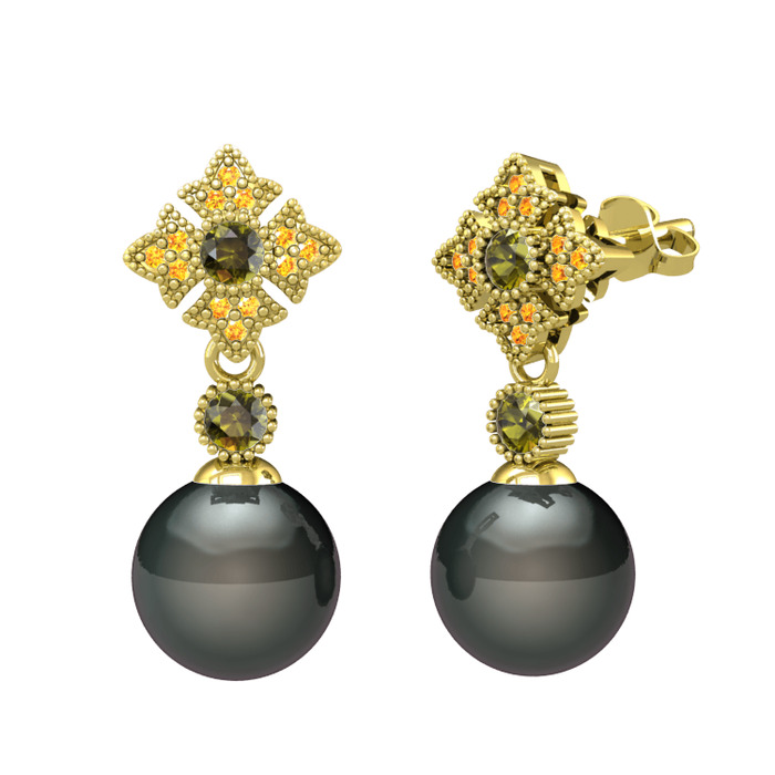 Siyah inci, peridot ve sitrin 18 ayar altın küpe