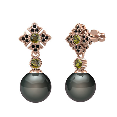 Siyah inci, peridot ve siyah zirkon 14 ayar rose altın küpe