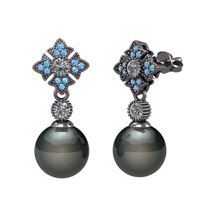 Siyah inci, pırlanta ve akuamarin 925 ayar siyah rodyum kaplama gümüş küpe (0.44 karat)