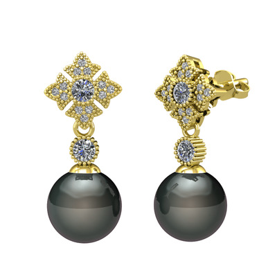 Siyah inci, pırlanta ve beyaz zirkon 14 ayar altın küpe (0.44 karat)
