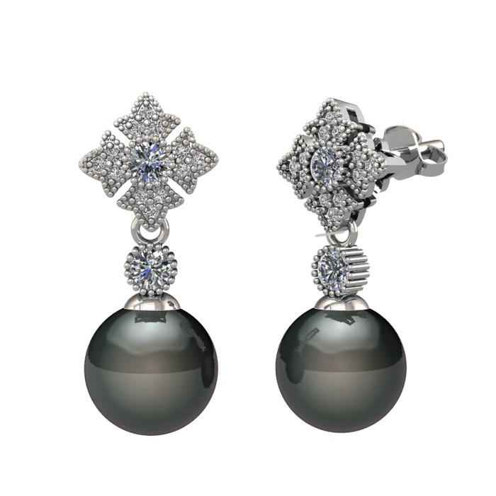 Siyah inci, pırlanta ve beyaz zirkon 18 ayar beyaz altın küpe (0.44 karat)