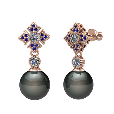 Siyah inci, pırlanta ve lab safir 8 ayar rose altın küpe (0.44 karat)