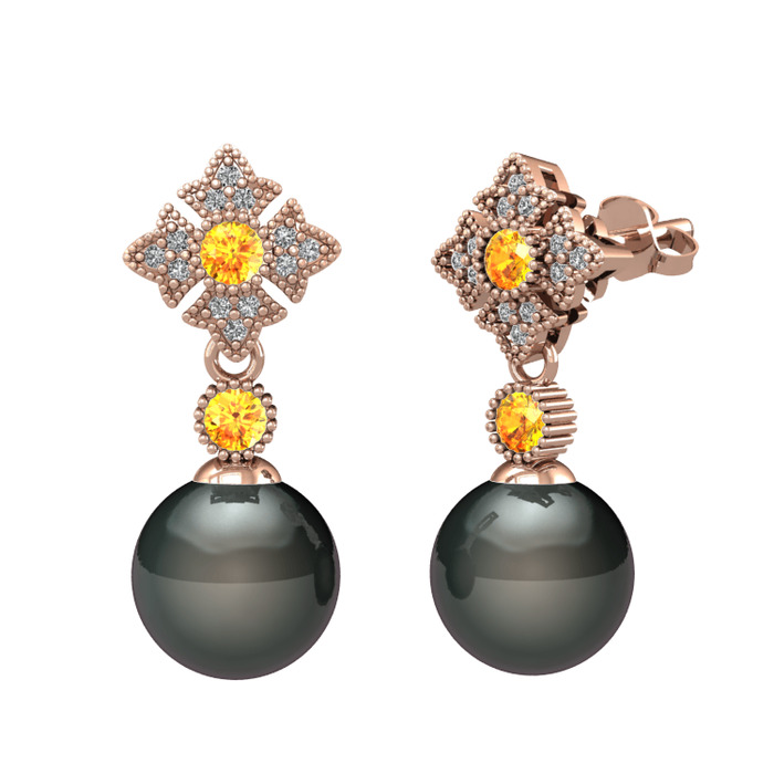 Siyah inci, sitrin ve beyaz zirkon 18 ayar rose altın küpe