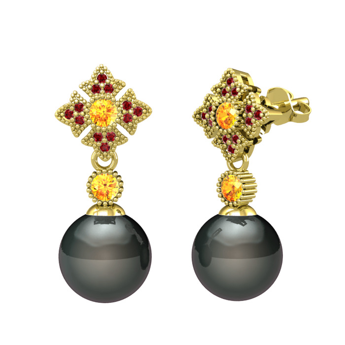 Siyah inci, sitrin ve garnet 8 ayar altın küpe