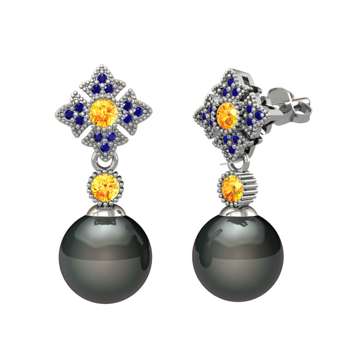 Siyah inci, sitrin ve lab safir 14 ayar beyaz altın küpe