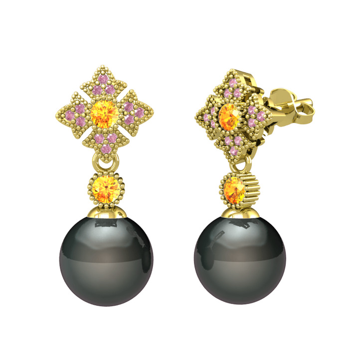 Siyah inci, sitrin ve pembe kuvars 14 ayar altın küpe