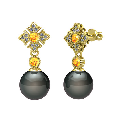 Siyah inci, sitrin ve pırlanta 18 ayar altın küpe (0.2112 karat)
