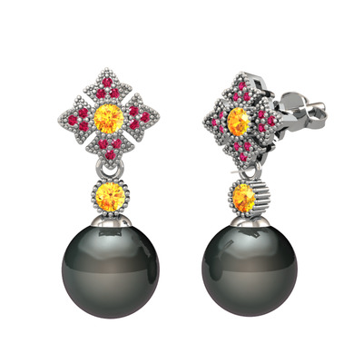 Siyah inci, sitrin ve rodolit garnet 14 ayar beyaz altın küpe