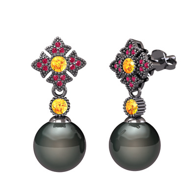 Siyah inci, sitrin ve rodolit garnet 925 ayar siyah rodyum kaplama gümüş küpe