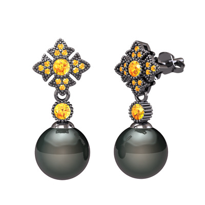 Siyah inci ve sitrin 925 ayar siyah rodyum kaplama gümüş küpe