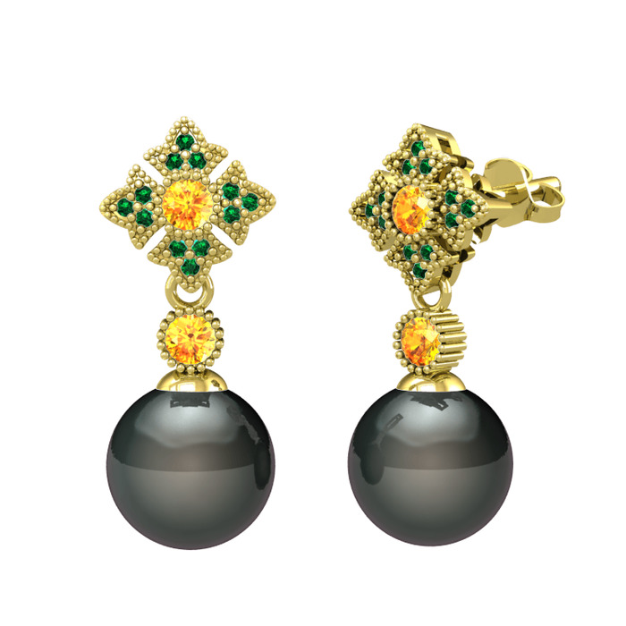 Siyah inci, sitrin ve yeşil kuvars 18 ayar altın küpe