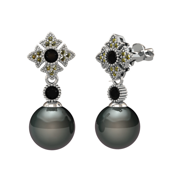 Siyah inci, siyah zirkon ve peridot 8 ayar beyaz altın küpe