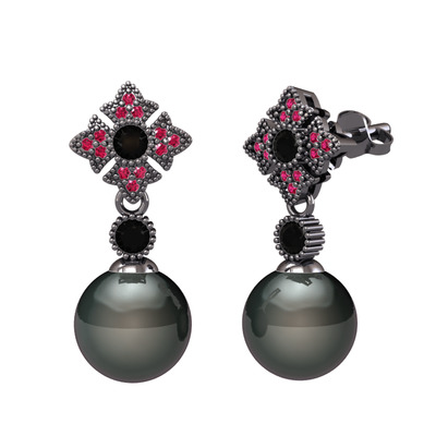 Siyah inci, siyah zirkon ve rodolit garnet 925 ayar siyah rodyum kaplama gümüş küpe