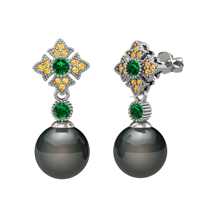 Siyah inci, yeşil kuvars ve sitrin 18 ayar beyaz altın küpe