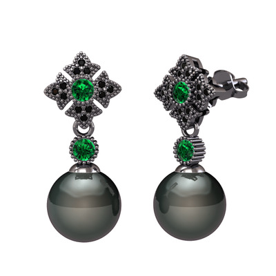 Siyah inci, yeşil kuvars ve siyah zirkon 925 ayar siyah rodyum kaplama gümüş küpe