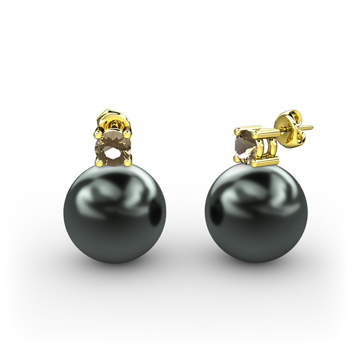 Siyah inci ve dumanlı kuvars 18 ayar altın küpe