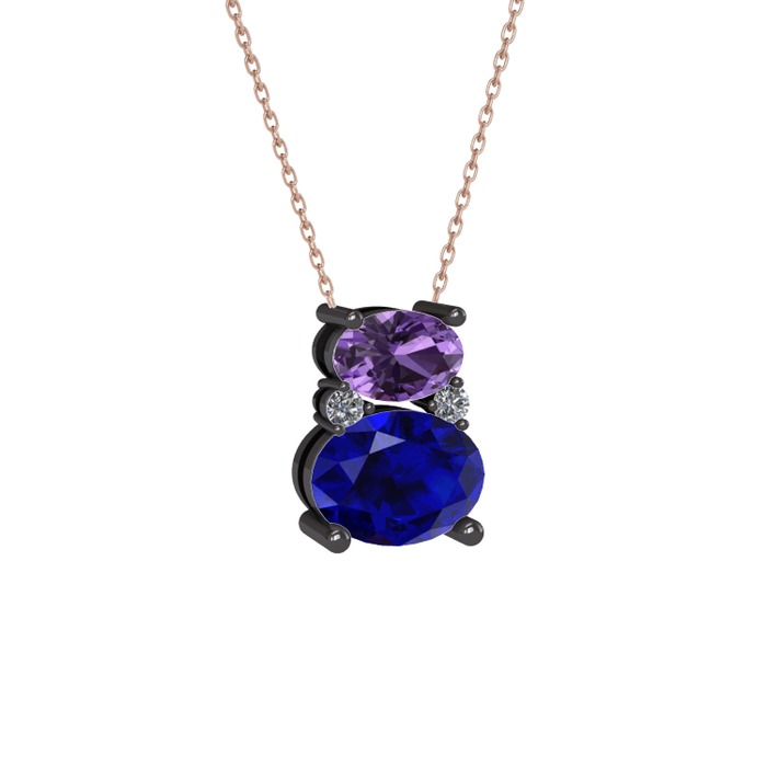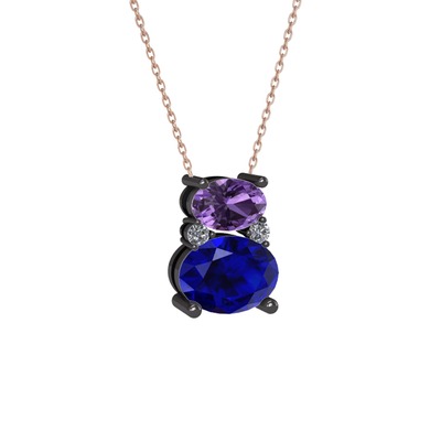 Ametist, lab safir ve pırlanta 925 ayar siyah rodyum kaplama gümüş kolye (0.036 karat, 40 cm gümüş rolo zincir)