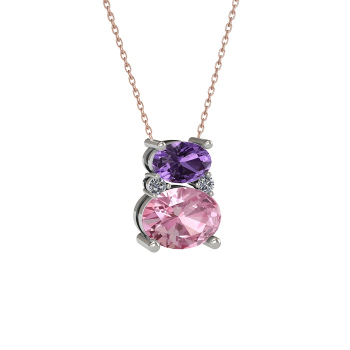 Ametist, pembe kuvars ve pırlanta 925 ayar gümüş kolye (0.036 karat, 40 cm rose altın rolo zincir)
