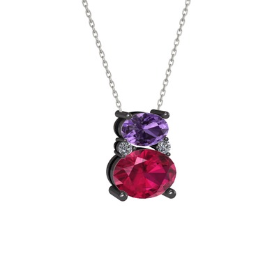 Ametist, rodolit garnet ve pırlanta 925 ayar siyah rodyum kaplama gümüş kolye (0.036 karat, 40 cm beyaz altın rolo zincir)