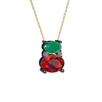 Kök zümrüt, garnet ve pırlanta 925 ayar siyah rodyum kaplama gümüş kolye (0.036 karat, 40 cm altın rolo zincir)
