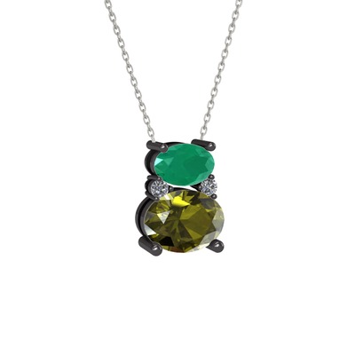 Kök zümrüt, peridot ve pırlanta 925 ayar siyah rodyum kaplama gümüş kolye (0.036 karat, 40 cm gümüş rolo zincir)