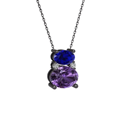 Lab safir, ametist ve swarovski 925 ayar siyah rodyum kaplama gümüş kolye (40 cm gümüş rolo zincir)
