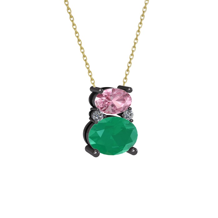 Pembe kuvars, kök zümrüt ve pırlanta 925 ayar siyah rodyum kaplama gümüş kolye (0.036 karat, 40 cm altın rolo zincir)