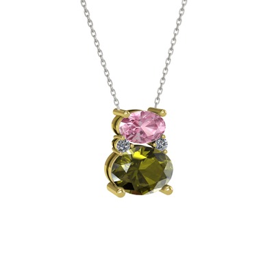 Pembe kuvars, peridot ve pırlanta 925 ayar altın kaplama gümüş kolye (0.036 karat, 40 cm gümüş rolo zincir)