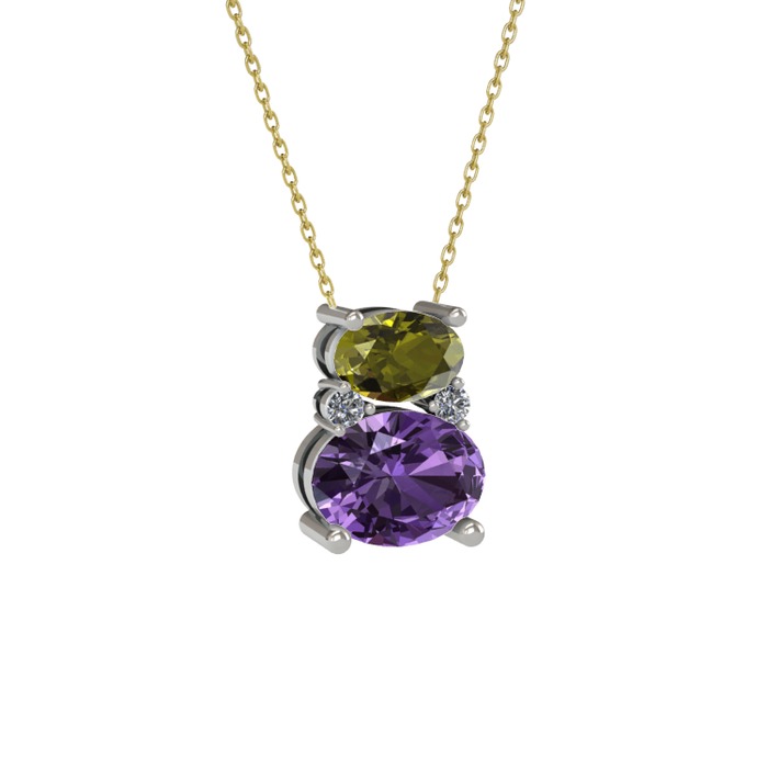 Peridot, ametist ve pırlanta 925 ayar gümüş kolye (0.036 karat, 40 cm altın rolo zincir)