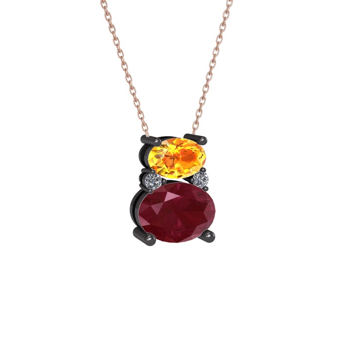Sitrin, kök yakut ve pırlanta 925 ayar siyah rodyum kaplama gümüş kolye (0.036 karat, 40 cm gümüş rolo zincir)
