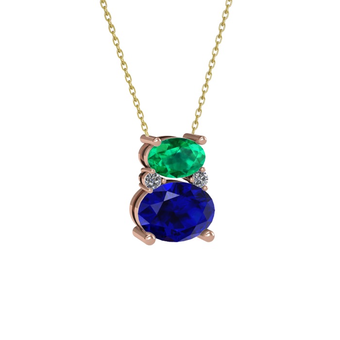 Yeşil kuvars, lab safir ve pırlanta 925 ayar rose altın kaplama gümüş kolye (0.036 karat, 40 cm altın rolo zincir)