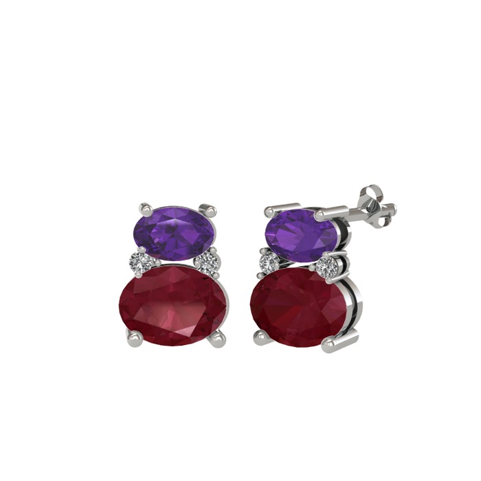 Ametist, kök yakut ve beyaz zirkon 14 ayar beyaz altın küpe