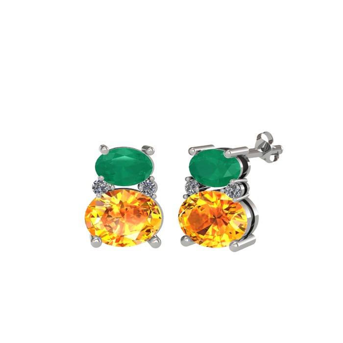 Kök zümrüt, sitrin ve pırlanta 8 ayar beyaz altın küpe (0.072 karat)