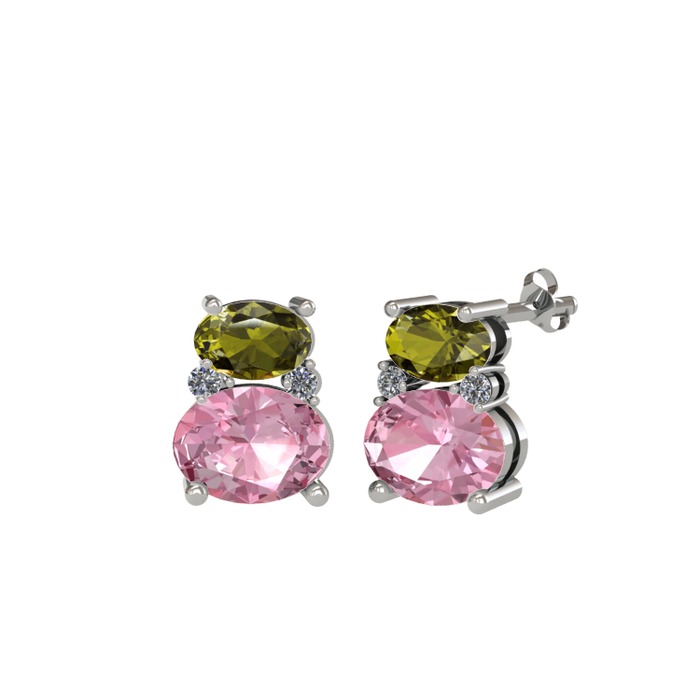 Peridot, pembe kuvars ve pırlanta 18 ayar beyaz altın küpe (0.072 karat)