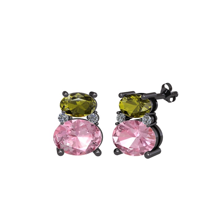Peridot, pembe kuvars ve pırlanta 925 ayar siyah rodyum kaplama gümüş küpe (0.072 karat)