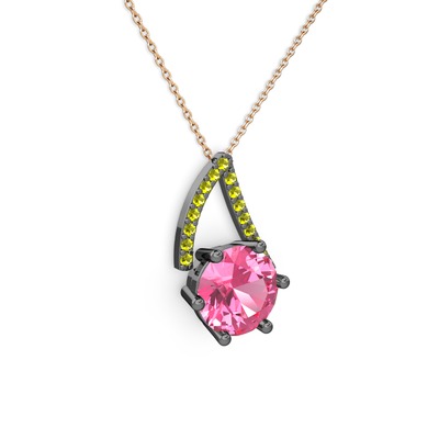 Pembe kuvars ve peridot 925 ayar siyah rodyum kaplama gümüş kolye (40 cm rose altın rolo zincir)