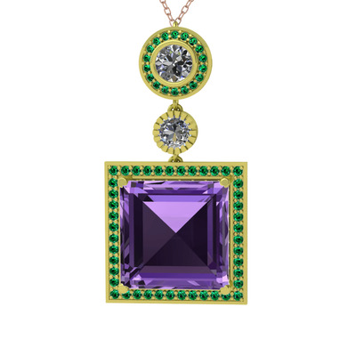 Ametist, beyaz zirkon ve yeşil kuvars 925 ayar altın kaplama gümüş kolye (40 cm gümüş rolo zincir)