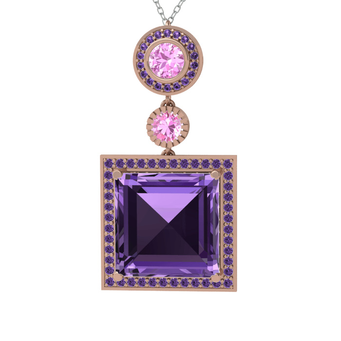 Ametist ve pembe kuvars 8 ayar rose altın kolye (40 cm beyaz altın rolo zincir)