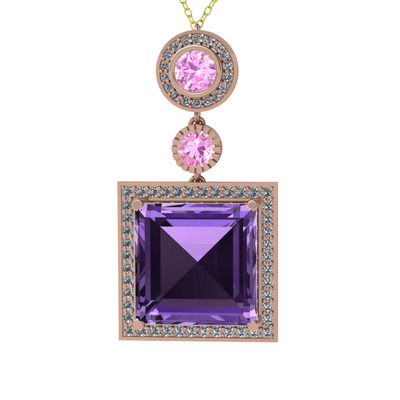 Ametist, pembe kuvars ve beyaz zirkon 18 ayar rose altın kolye (40 cm gümüş rolo zincir)