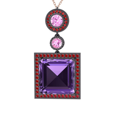 Ametist, pembe kuvars ve garnet 925 ayar siyah rodyum kaplama gümüş kolye (40 cm rose altın rolo zincir)