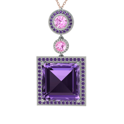 Ametist ve pembe kuvars 925 ayar gümüş kolye (40 cm rose altın rolo zincir)