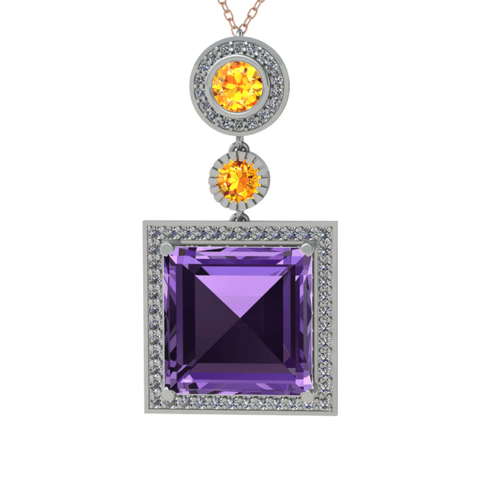 Ametist, sitrin ve beyaz zirkon 14 ayar beyaz altın kolye (40 cm rose altın rolo zincir)