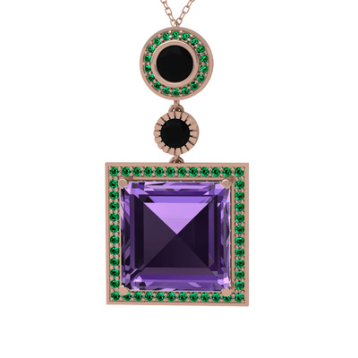 Ametist, siyah zirkon ve yeşil kuvars 18 ayar rose altın kolye (40 cm rose altın rolo zincir)