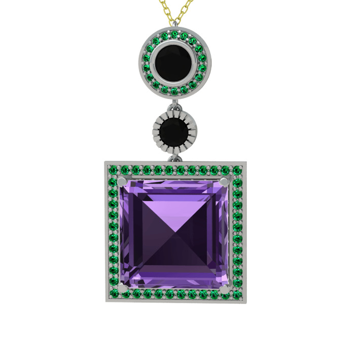 Ametist, siyah zirkon ve yeşil kuvars 8 ayar beyaz altın kolye (40 cm altın rolo zincir)