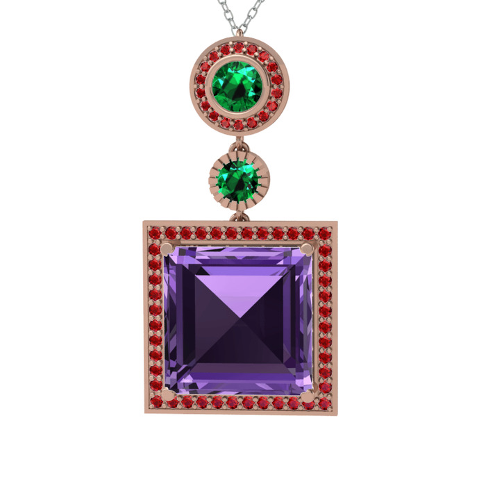 Ametist, yeşil kuvars ve garnet 18 ayar rose altın kolye (40 cm gümüş rolo zincir)