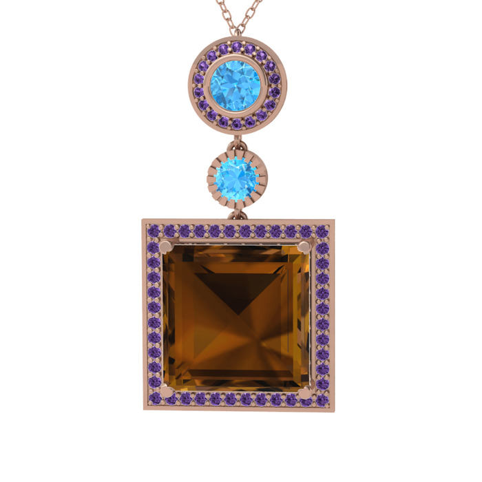 Dumanlı kuvars, akuamarin ve ametist 14 ayar rose altın kolye (40 cm rose altın rolo zincir)